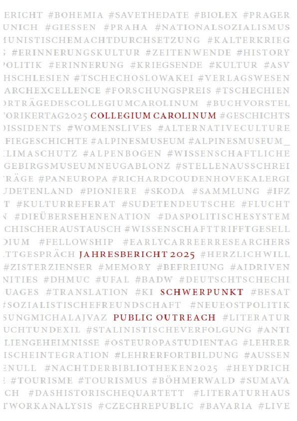 The Annual Report of Collegium Carolinum provides a clear overview of the activities of the Institute. Each year, a new focus topic is chosen in order to offer readers a deeper insight into a particular research area or into specific developments at the institute